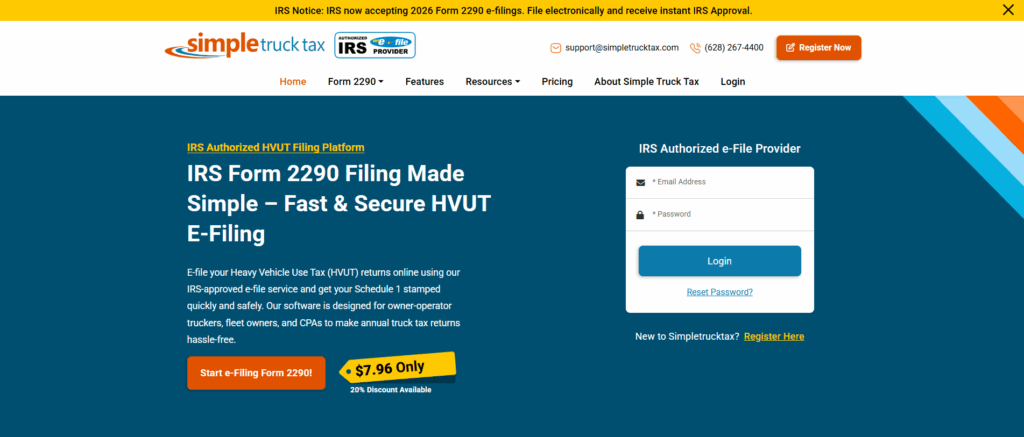 SimpleTruckTax focuses on the filers who prefer a budget-friendly eFiling solution, especially targeting owner-operators. One of the reasons behind the platform’s popularity is its extreme affordability; it frequently offers the lowest entry-level filing fees and in fact, provides free first-time filing for new users. Furthermore, the system is known for its high speed; it provides stamped Schedule 1 in minutes.